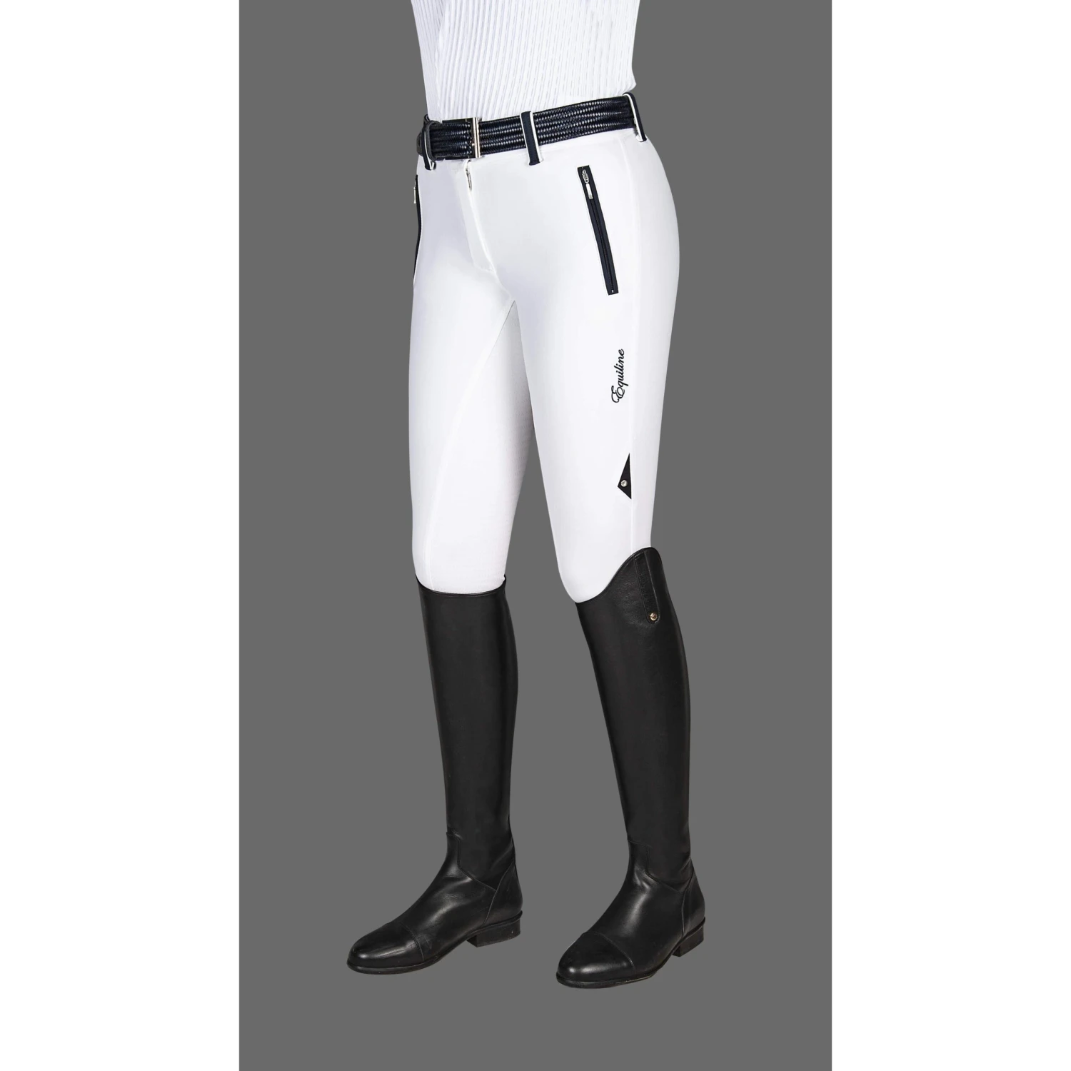 Equiline Angy Full Grip Breeches in white with striking navy contrast accents make ideal competition breeches, and are perfect for adding a stylish twist to your outfit. The dark navy contrast stripes on the front and back zip pockets, and belt loops co-ordinate perfectly with a navy show jacket, for complementary matchy!