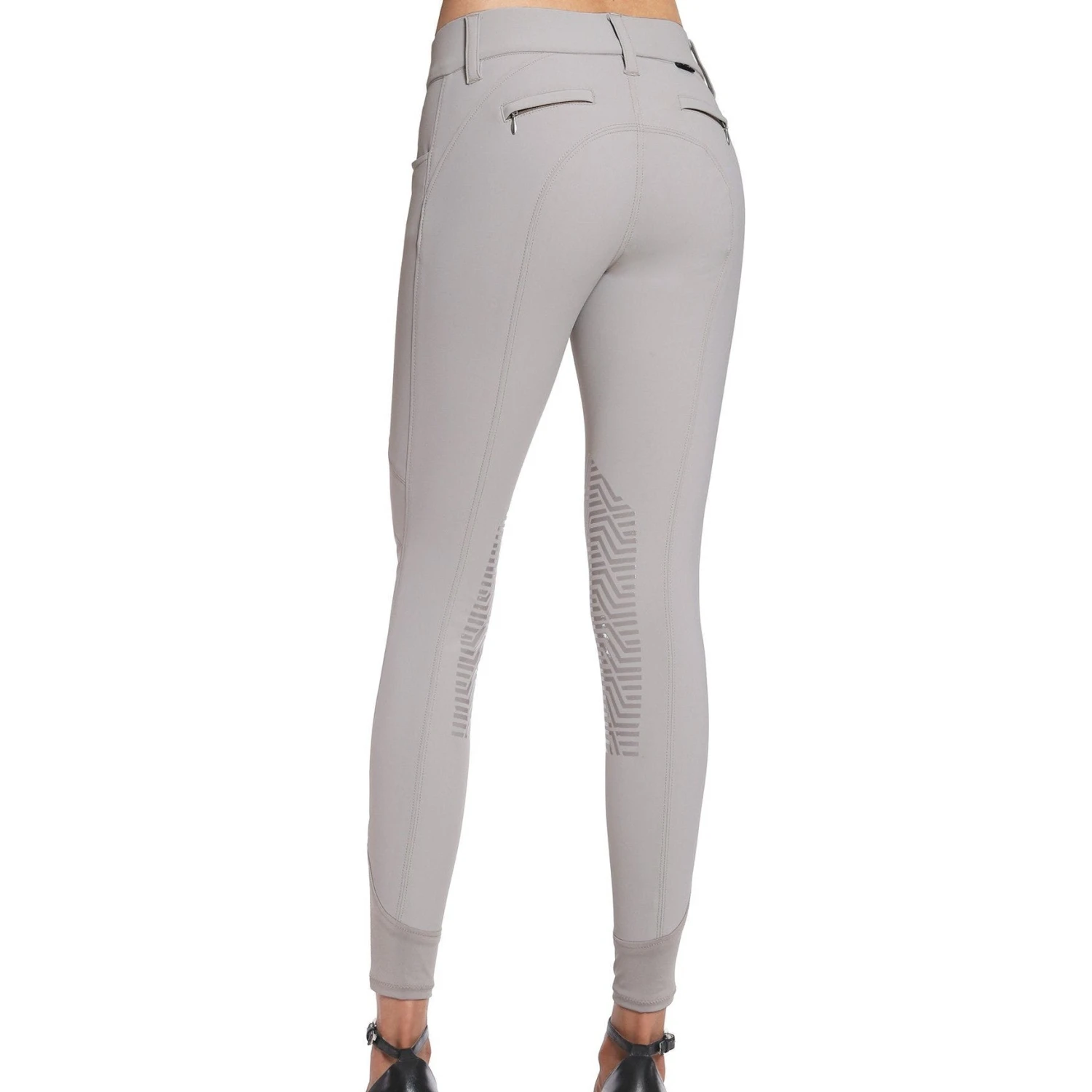 This breech features ultra figure flattering seaming and piping details, grippy geometric silicone knee patches, a soft flexible knit leg cuff for a form fitting feel under your riding boots, and Ghodho signature logo embroidery.
