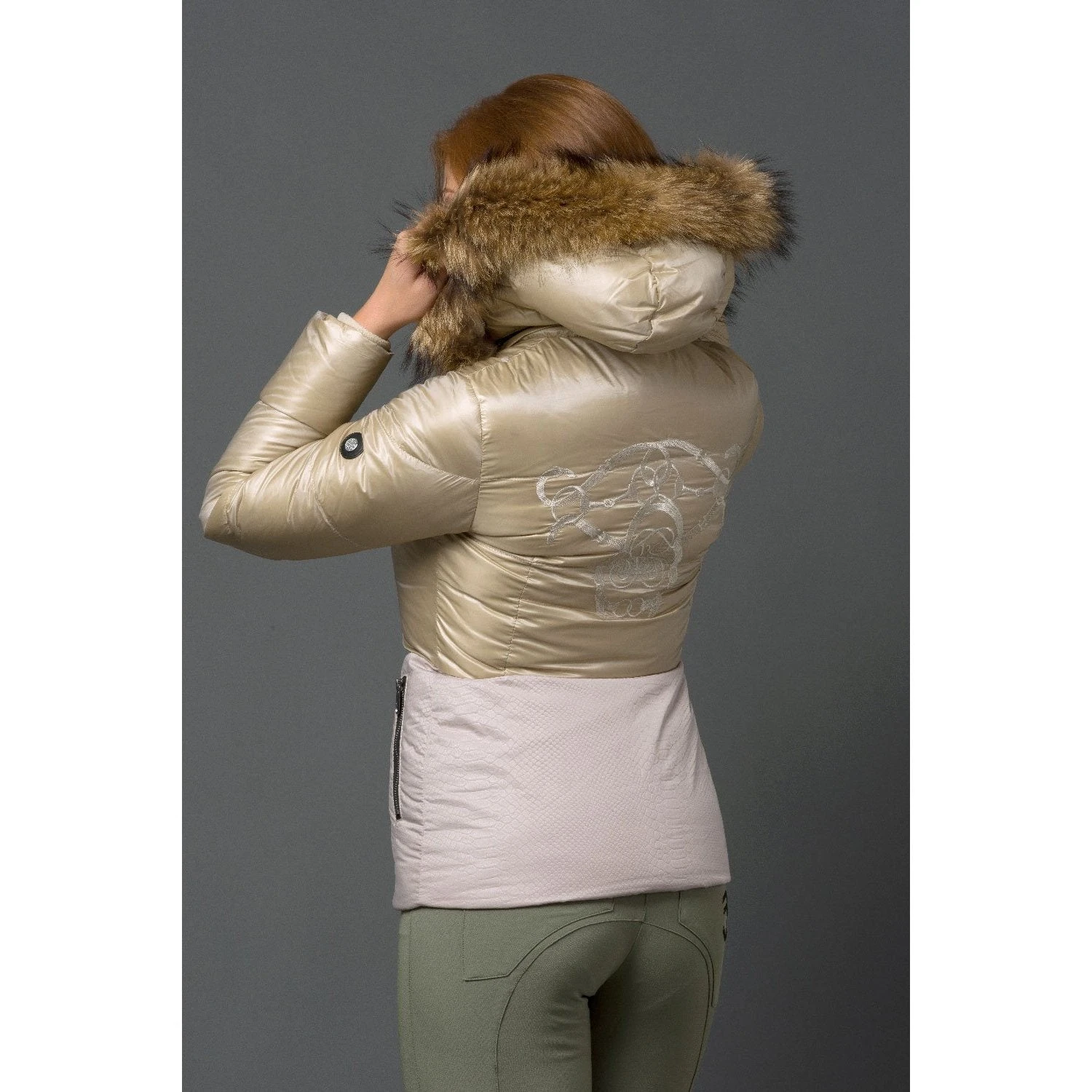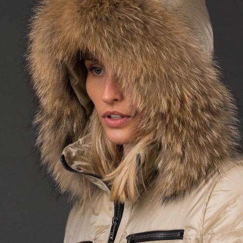 The Lucie padded jacket produced by Joshua Jones UK has the style and design to keep you delightfully warm and comfortable. This beautiful jacket is tailored at the waist. A jacket for all occasions, night or day, you really will can’t go wrong with this elegant item in this beautiful champagne colour. Duck down and very warm, trimmed in racoon fur. Accessories to match the gorgeous fur trim in silver, with a contrasting snakeskin print material bottom.