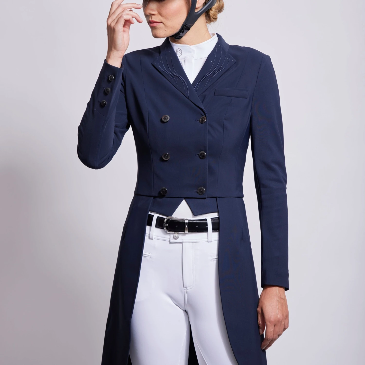 The Flame Dressage Tails is made of a highly breathable, soft, lightweight and durable technical fabric for optimal comfort. The inside of the jacket is designed with stretch and mesh material to ensure excellent breathability and maximum freedom of movement. The Flame Tails are embellished with tone-on-tone embroidery on the collar and back with Swarovski® crystals and Metal Dots.