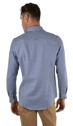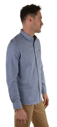 Style with a tailored fit and a small scale textured yarn dyed check, extra stretch for comfort and movement, contrast chambray facing on the inside of the collar stand, internal neck stripe taping, concealed collar peak buttons, and removable collar stays. Faux leather label at the hem and contrast cuf at the sleeve.