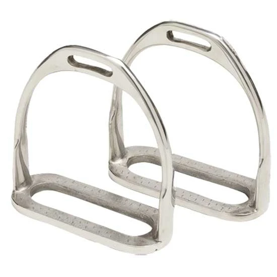 This style of stirrup may also be referred to as a Plain or English Hunting Iron . It is one of the most basic stirrup patterns used and is characterised by the rounded sides, perpendicular eye for the stirrup leather and small metal grips on the tread.